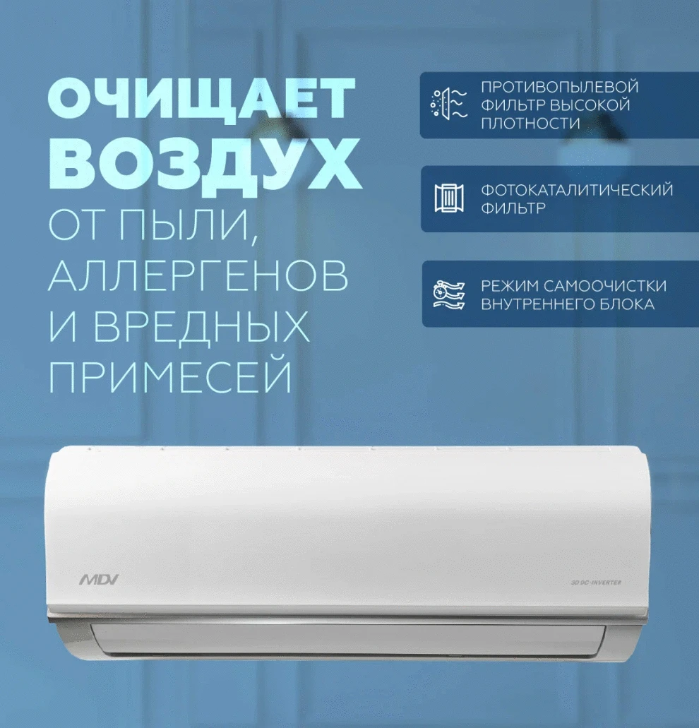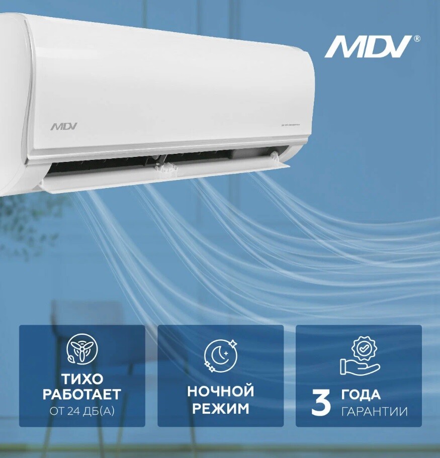 Линейка доступных инверторных сплит-систем MDV по стоимости сопоставима с кондиционерами постоянной производительности. Несмотря на то, что данная модель считается базовой, в ней есть все необходимое для комфорта и удобства пользователя. Система работает на экологичном фреоне R32 и поддерживает удаленное управление по Wi-Fi-сети (опция). Внутренний блок оснащен двойной системой фильтрации: в комплект входит фильтр высокой плотности и фотокаталитический фильтр. Линейка поставляется в комплекте со стильным ИК-пультом RG10, поддерживающим функцию Follow me, благодаря которой температура в месте нахождения пользователя точно соответствует заданным параметрам.